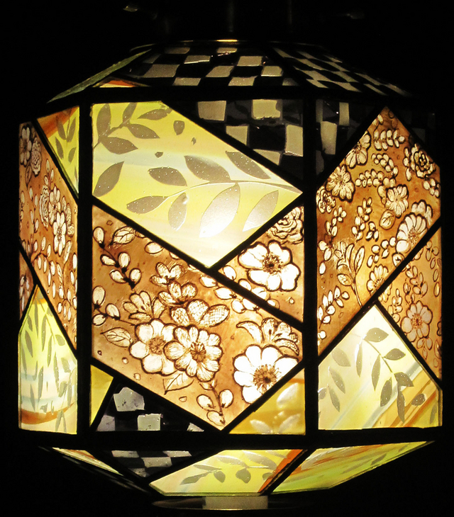 このランプの台は10年以上前に盛岡の家具屋さんで見つけて、木のぬくもりが気に入って、買い、ずっとどんなランプを付けようかと考えて、やっと和風のイメージで作製しました。またまた製図がいい加減で、取り付けるのに先生方にご迷惑をおかけしましたが、木のぬくもりと辻が花がマッチし、大変気に入っております。ありがとうございました。