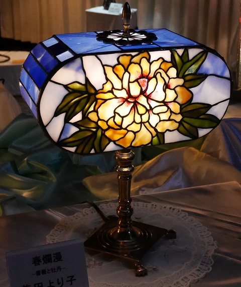 作者です。我が家の庭にも、今、えんじ色の牡丹が咲いています。好きな花の一つで過去に作った作品にも牡丹が多いです。また、ランプの型はお菓子の箱を使いました。大変だったのはスパイダーの付け方で先生にお願いしてしまいました。この形のためのベースも悩みました。手持ちのベースで使えるものはと考えた時、これがいいわよと言う仲間の一言で決まりました。この花にこの形、この形にこのベースと考えるのもステンドグラスの楽しみかたかなと思っています。
