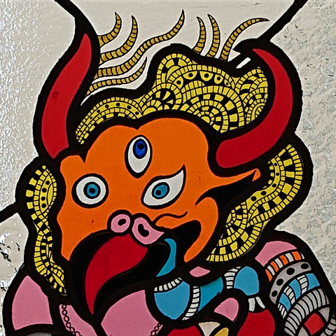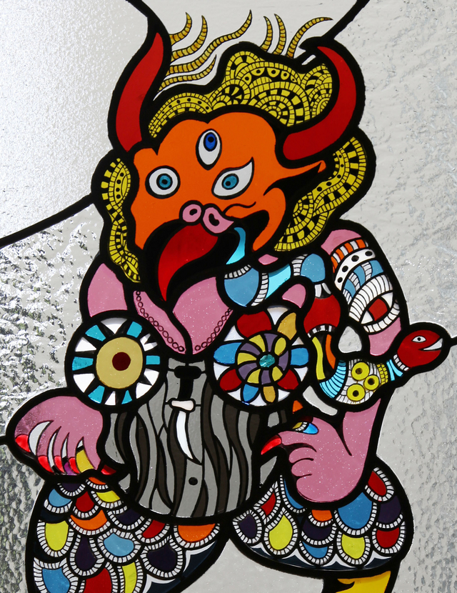 ステンドグラスの世界に入門して7年目、いつかは… と思っていたニキの世界に今回挑戦しました。急いで描かれたであろう原画は、着色がなされていない部分があったり、端部が切れてしまっていたりするため、パネルの制作にあたっては、原作者と共同制作をさせてもらう気持ちで、ある程度自分の解釈やアレンジも加えさせていただきました。