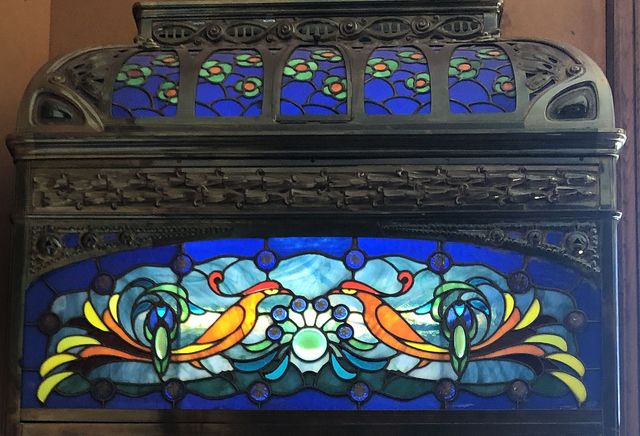 キャビネットの上部のステンドグラスを拡大すると・・・