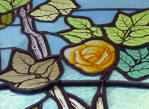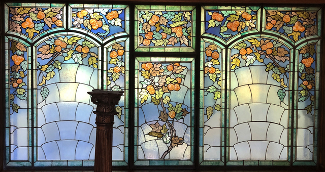 上のステンドグラスは、前回のブログの最後の写真にチラッと映っていた、階段室のステンドグラスの一部です。