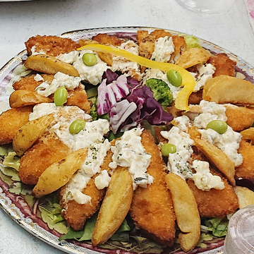克拓さんのフィッシュ&チップス サラダ添え。タルタルソースがけ。