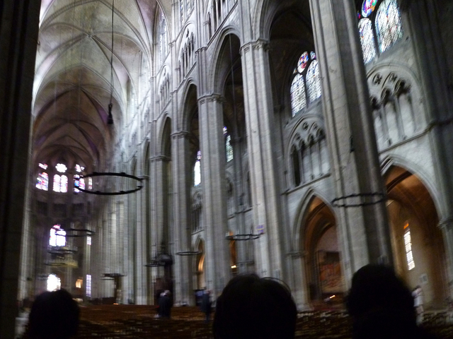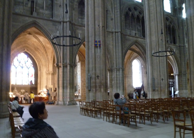この長ーい身廊で、3段にステンドグラスがあるので、かなりの数のステンドグラスがあります。ただ、側廊が二重のため柱も多いので、一度にステンドグラスがわぁ〜たくさんある! という感じではないかな。