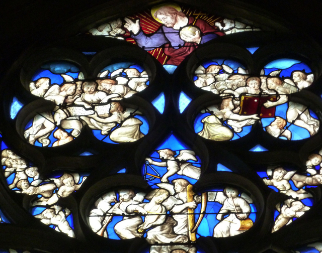 南北同じようなデザインの部分などの時に、「北側には寒色系」 「南側には暖色系」 のガラスを使うのが通例で、どこの大聖堂でも確認してきました。