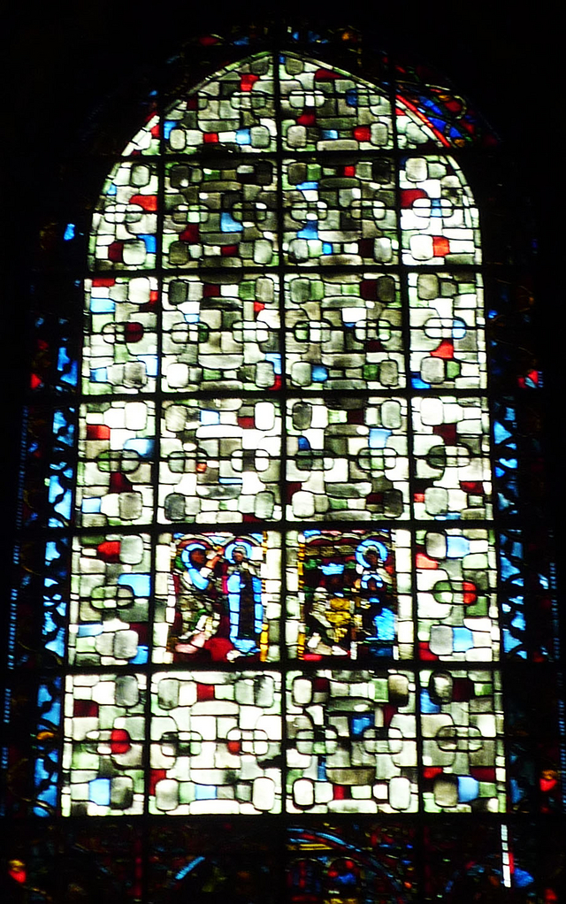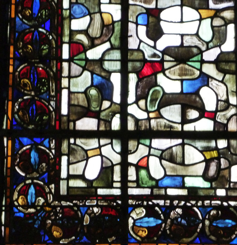 下の写真の部分だけ13C?のステンドグラスを残して、そのほかは傷みが激しいので、他のデザインにしたのかな、と思いました。