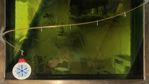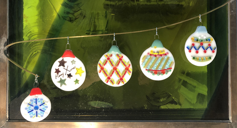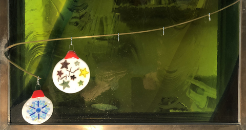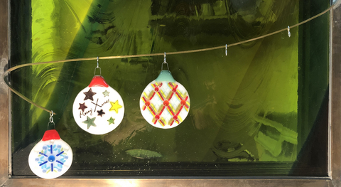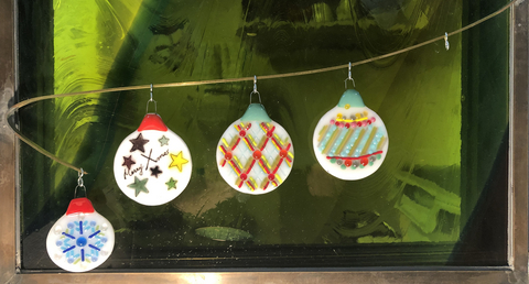 Xmasツリーによく吊り下げる、丸いボール型のオーナメントに見立てた、「ガラスのオーナメント」を吊り下げていきます。高橋講師作。