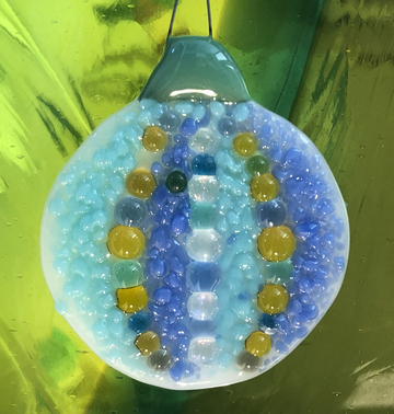 小さく丸く焼いた黄色やブルーのガラスを、その土台のガラスの上に置いて焼きました。