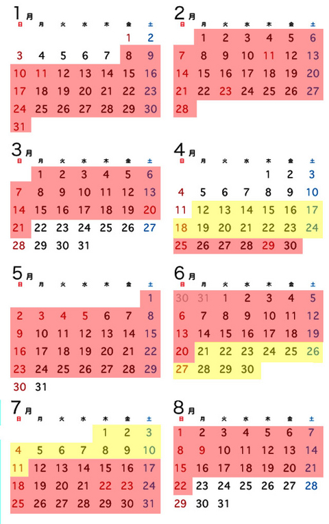 下のカレンダーで、ピンクの部分が 「緊急事態宣言」の期間