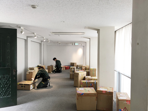 昨日、皆さんが各自で梱包した段ボール箱が、30個以上並んでいます。