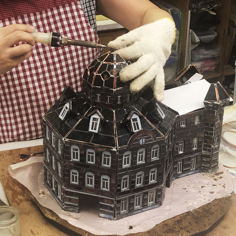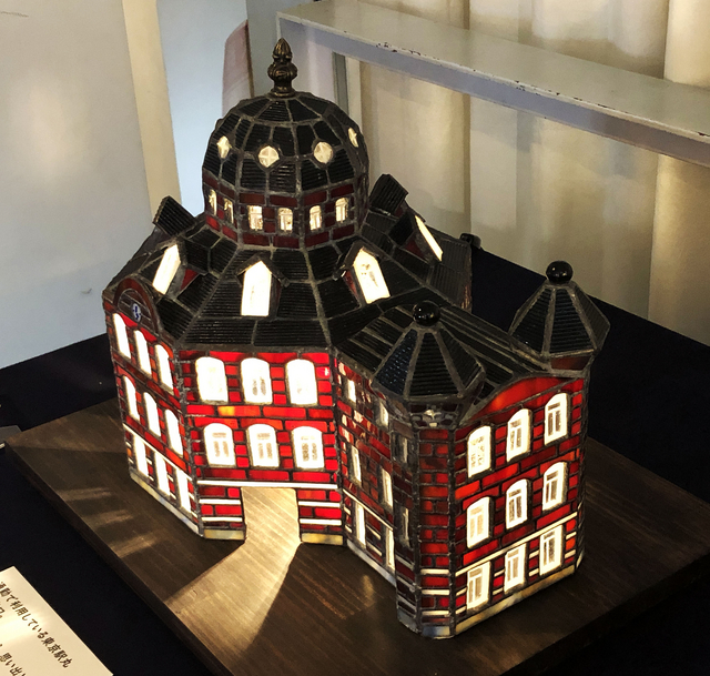 前回のブログでご紹介した、赤レンガ造りの東京駅 丸の内口 駅舎型のステンドグラスランプ。