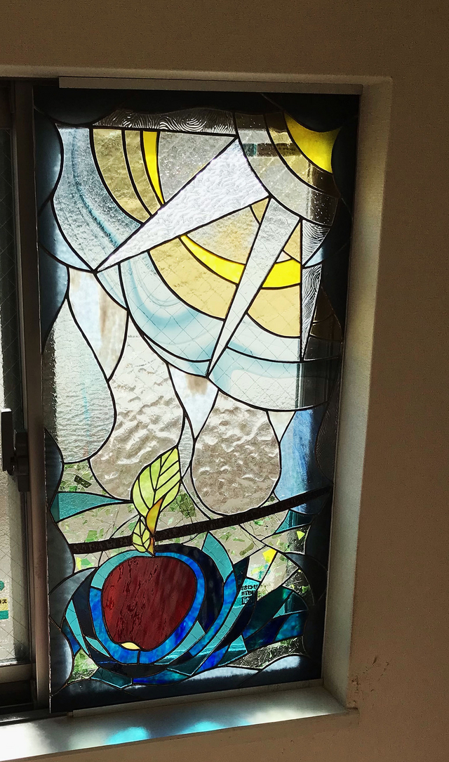 設置先が、東側の窓だったので、太陽のイメージが先に来て、入れたかったりんごのモチーフに繋げていきました。