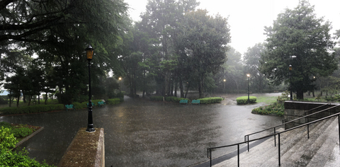 写真のように、大倉山記念館の前は非常に強い雨で水浸し。