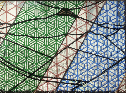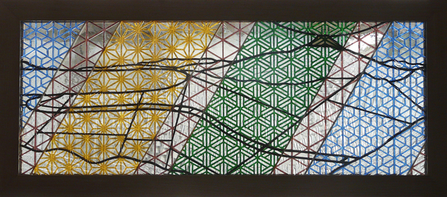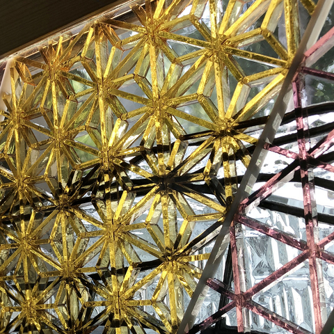 組子のパネルの背面に鉛線で組まれたステンドグラスが当ててあります。