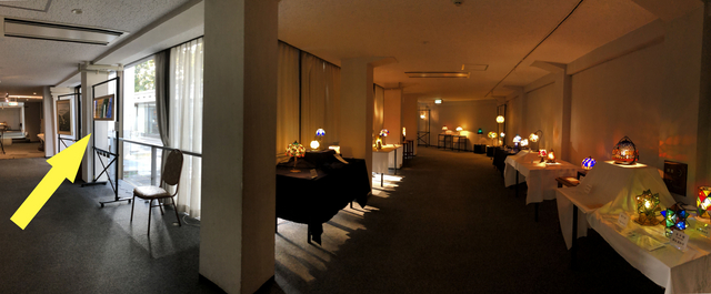 ランプの展示コーナーから、右へ周り込んだ会場の最終コーナーの中庭側の窓に展示しました。