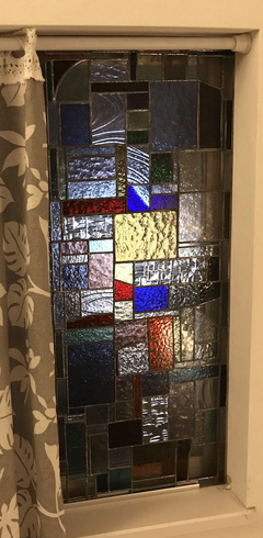 先に完成した作品の右隣に設置しましたが、偶然、青系のガラスが斜めに配置される構図になっており、一枚に見えないこともなく、出来上がりには満足しています。