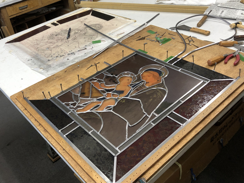 焼成したガラスを、板ガラスにロウで留めて、グリザイユを全面に塗ります。