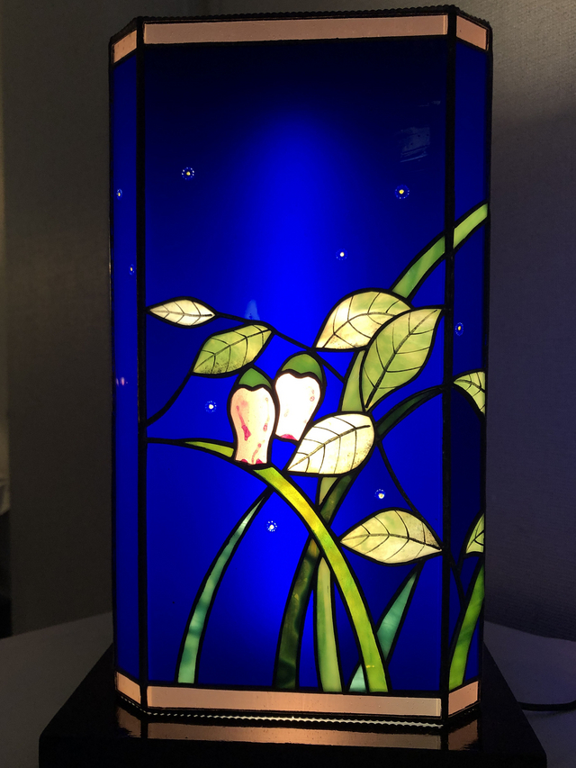 ホタルブクロに蛍が舞う情景を濃いコバルトブルーのガラスを背景に描いた。