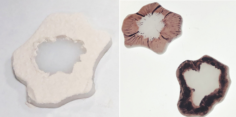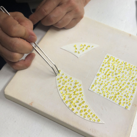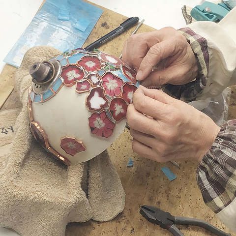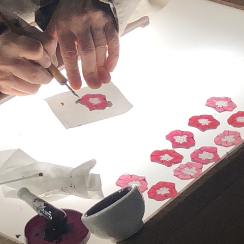 サンドブラストと絵付けで花びらを制作