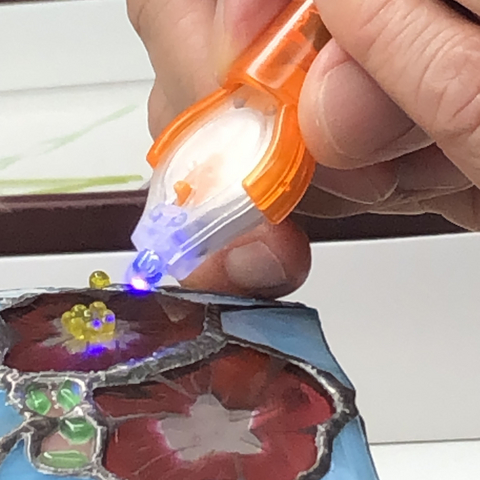 ストリンガーをバーナーで伸ばして花芯を作り、ツブツブと共にUV接着した。
