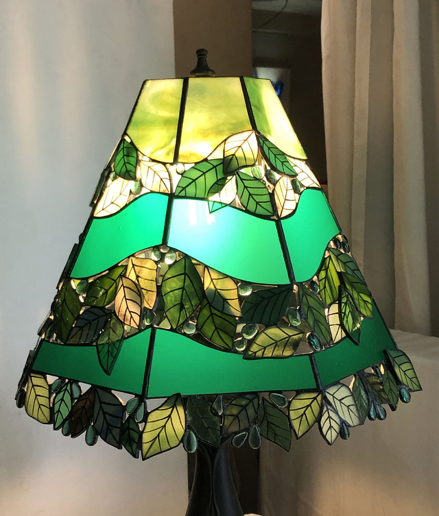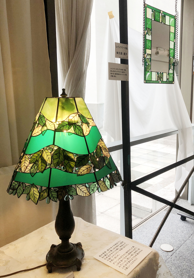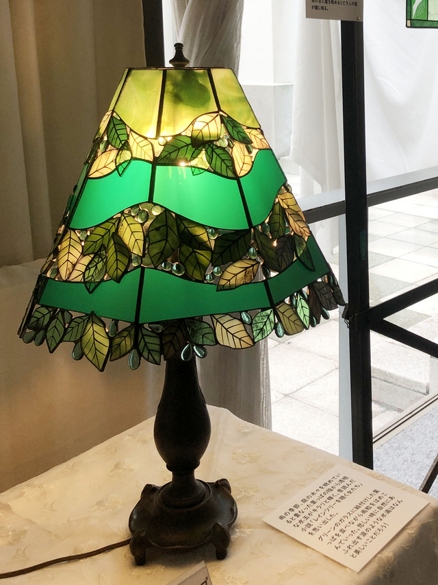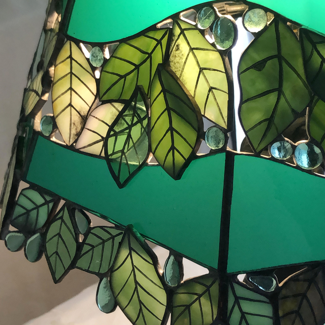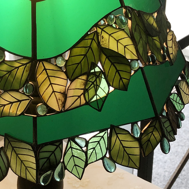グリーンのガラスに絵付けした葉っぱを並べながら雨粒をはめこんでいった。