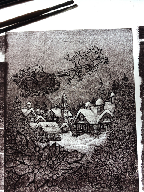 ↑ 線描きをした後、ガラス一面に、茶色の絵具を塗ります。