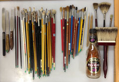 左から、パレットナイフ・線描き用の筆・シェイディング用の油彩筆・