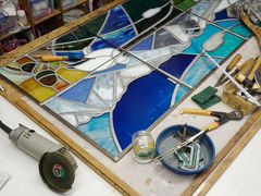 今日は、ステンドグラスパネルの周囲に、チャンネル (コの字の真鍮)