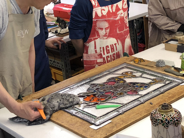 (写真は、制作中の長沼さんと、皆で作品を見ているところ)