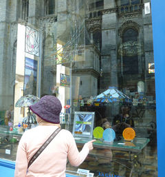 ショーウインドウのガラスに大聖堂が映っていますね。