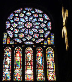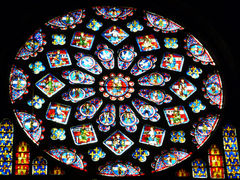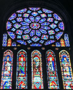 このステンドグラスは、ルイ9世の母后のブランシュ・ド・カスティーナの寄進によるものなので、ルイの紋章の百合とブランシュ家の紋章が描かれています。