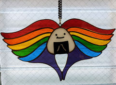知人が経営する「おむすびBar 八」のシンボルマークをモチーフに、LGBTQカラーの羽を付け、サンキャッチャーを制作しました。