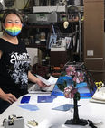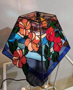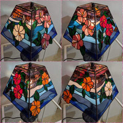 今までの作品とは違い、ランプのライトの光の透過を考えながらのガラス選びは楽しくも悩めたし、ハイビスカスを3Dに仕上げる新しい手法もご指導頂きました。