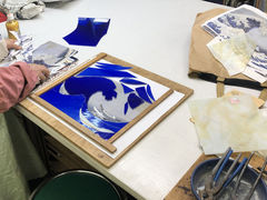 被せガラスを使い、サンドブラストで青と白をつくりこみ
