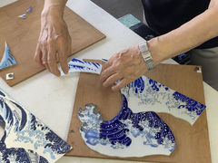 空色や白のエマイユで波やしぶきを表現。