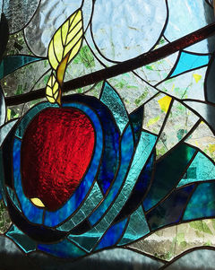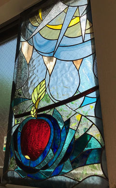 設置先が、東側の窓だったので、太陽のイメージが先に来て、入れたかったりんごのモチーフに繋げていきました。