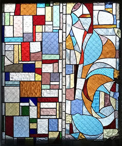 先に完成した作品の右隣に設置しましたが、偶然、青系のガラスが斜めに配置される構図になっており、一枚に見えないこともなく、出来上がりには満足しています。