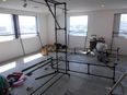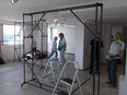 こう、こう、こうやって窓ごとにセットしてある鉄パイプを組んでください。