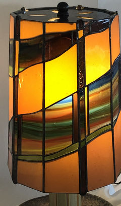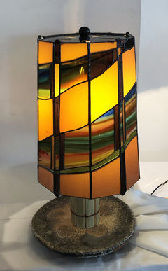 ガラスの色や陶板に合わせて、竹などを使って、和風なランプペースを手作りしました。