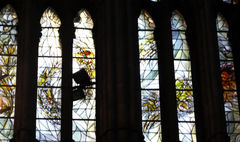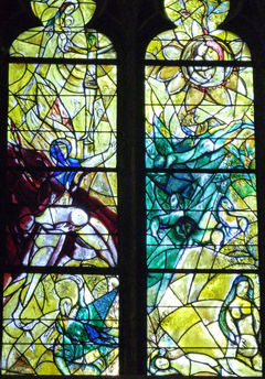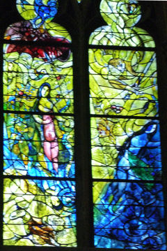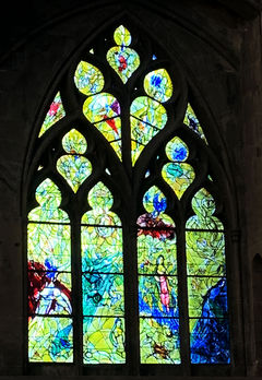 袖廊にあるシャガールのステンドグラスは、正面の大きな黄色っぽいステンドグラスと