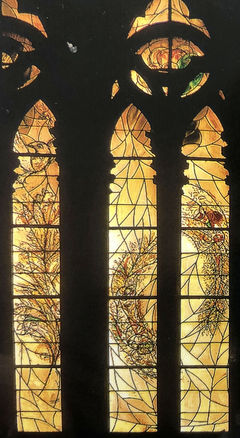 花のブーケというステンドグラスで、花と鳥が描かれています。