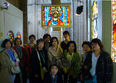 下の写真は2016年6月に、イーリー大聖堂の「イーリー ステンドグラス美術館」に皆と行った時の写真です。ステンドグラスの下の背の高い女性がジャスミン博士です。