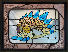 ダイクロをフュージングしたガラス、羽根に使われたイリデッセントのガラスが、日が暮れると室内の電気でこのように輝きます。