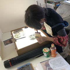 ガラスに線描きして、焼成します。