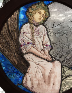 聖母の前方にすわっている少女は民族衣装を身につけ、ツタを編んだ輪飾りをもっています。ツタは永遠をあらわすとされ、少女は今が永遠に続くものと疑いもせず、時の流れを感じていないかのような風情にみえます。