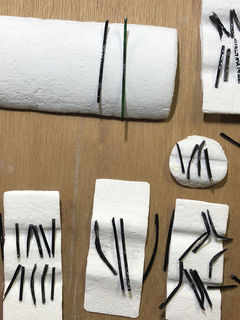 まずは、細くカットしたガラスをウェットフエルトで作った型に乗せ